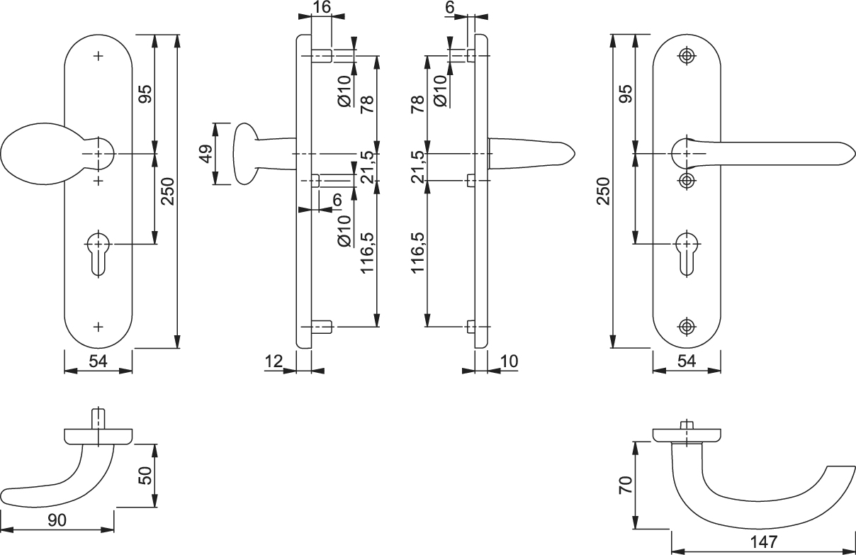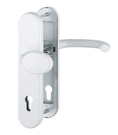 HOPPE – hliníková bezpečnostní garnitura klika/knoflík na dlouhém štítu pro vchodové/bytové dveře: