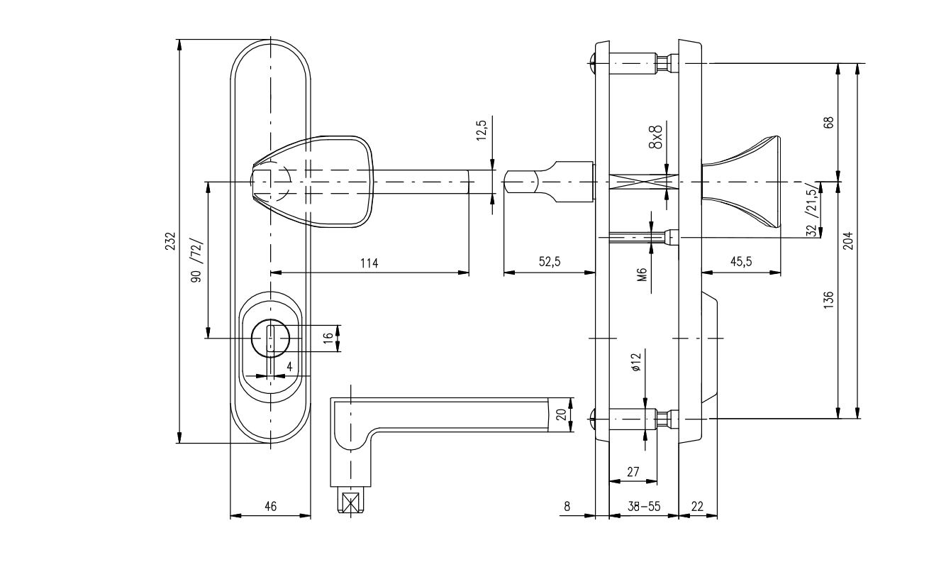 • Rozměry štítu 46 × 232 mm, kliky 114 mm a čtyřhranu 8x8 mm.