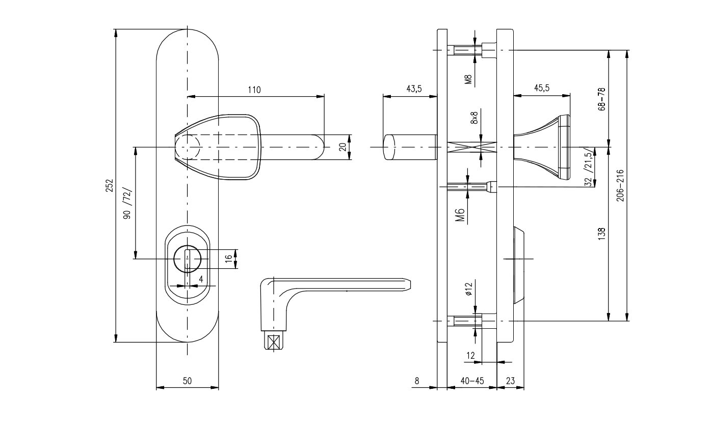 • Rozměry štítu 50 × 252 mm, kliky 110 mm a čtyřhranu 8x8 mm.