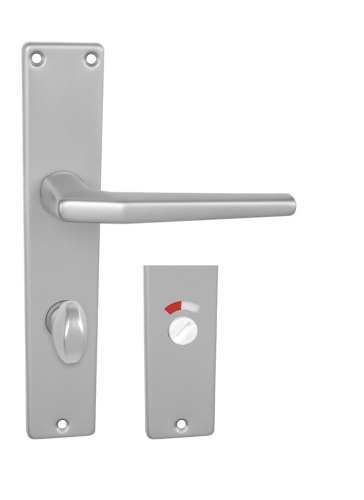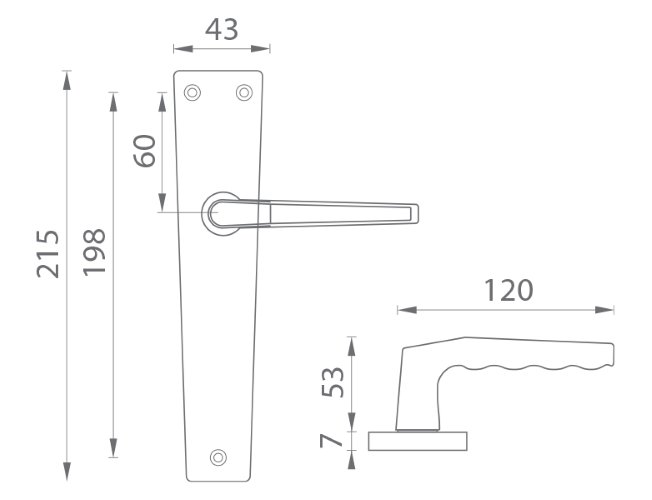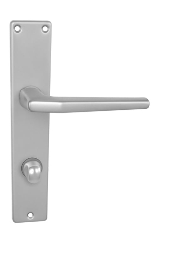 Štítová klika na interiérové dveře s hranatým štítem je vyrobena z hliníku a je povrchově upravena. Hranatý štít má rozměry 43 mm x 215 mm a klika neobsahuje vratný mechanismus.
