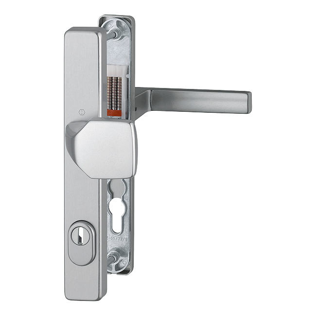 HOPPE – hliníková bezpečnostní garnitura klika/knoflík na úzkém štítu se zakrytím cylindrické vložky pro profilové dveře.