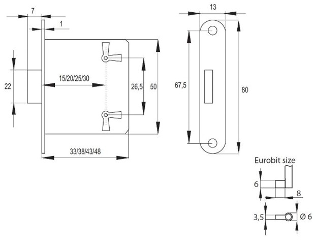 Pravolevý zámek s nutností zadlabání do čela dvířek. Klíčová dírka je vzdálená od čela 25mm. Klíče nejsou součástí balení, možnost objenání v sekci Doplňky, díly a příslušenství.