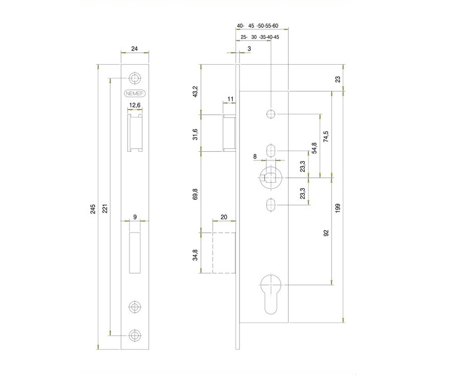 • rozteč 92 mm, backset 25, 30, 35, 40, 45 mm, hloubka zádlabu 40, 45, 50, 55, 60 mm (specifikováno v názvu produktu)