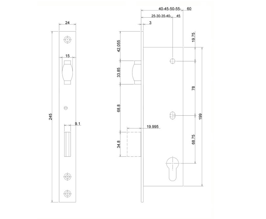• Backset 25, 30, 35, 40, 45 mm s hloubkou zádlabu 40, 45, 50, 55, 60 mm.