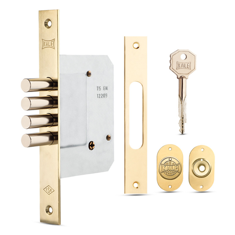 Bezpečnostní zadlabací zámek se závorou, s křížovým klíčem. Dorn 52 mm. Povrchová úprava čela mosaz. Dodáván včetně 3 klíčů, protiplechu a krytky.