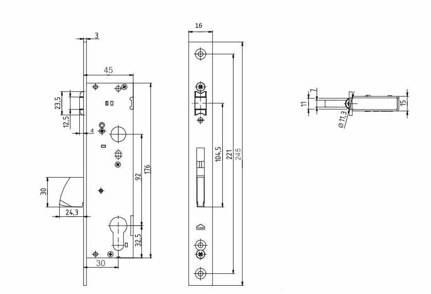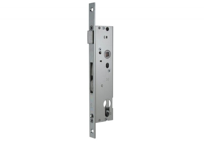 Zámek pro kovové a hliníkové konstrukce na liště šíře 16 mm s výklopnou závorou v provedení se střelkou.