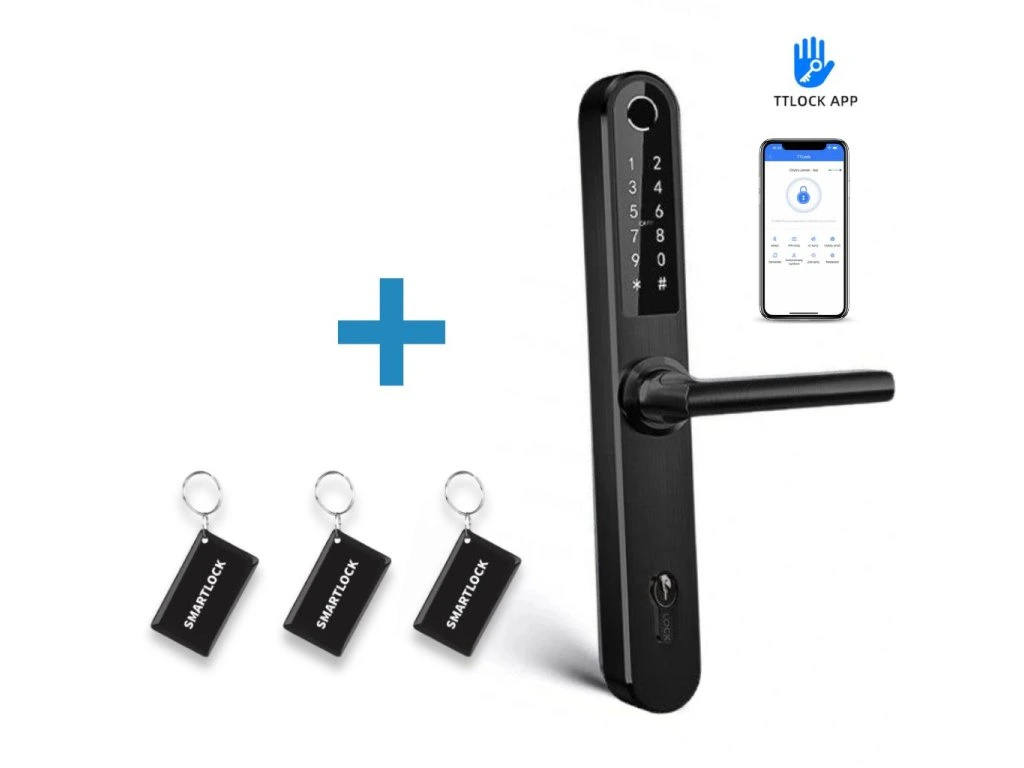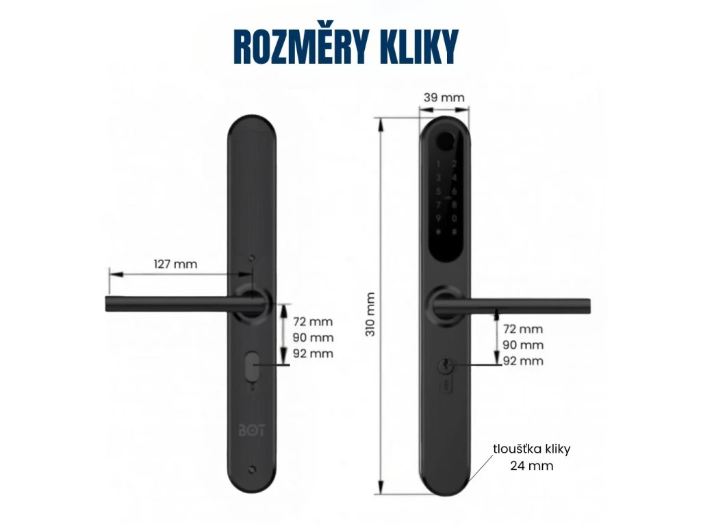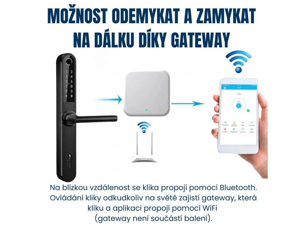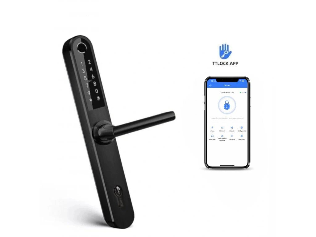 Bluetooth / WiFi chytrá klika, vhodná pro interiérové i exteriérové použití, ovládání přes aplikaci TTlock, 5 možností odemykání (klíč, otisk prstu, číselný kód, čipová karta, mobilní telefon), varianty na rozteč zámku 72 mm, 90mm nebo 92mm, doporučená tloušťka dveří 35-75 mm, možnost pravé i levé orientace, napájení bateriemi 4ks AA, černá