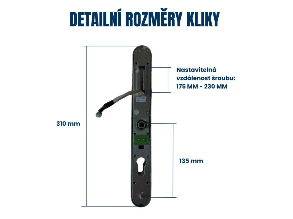 ✔ Rozměry kliky: výška kliky 310 mm, šířky kliky (bez gumového těsnění) 38 mm, celková šířka kliky (s gumovým těsněním) 41 mm, délka madla 127 mm, rozteč šroubů a jejich vzálenost spodního šroubu od čtyřhranu: 135 mm, rozměr roztečí mezi šrouby: 175-230 mm