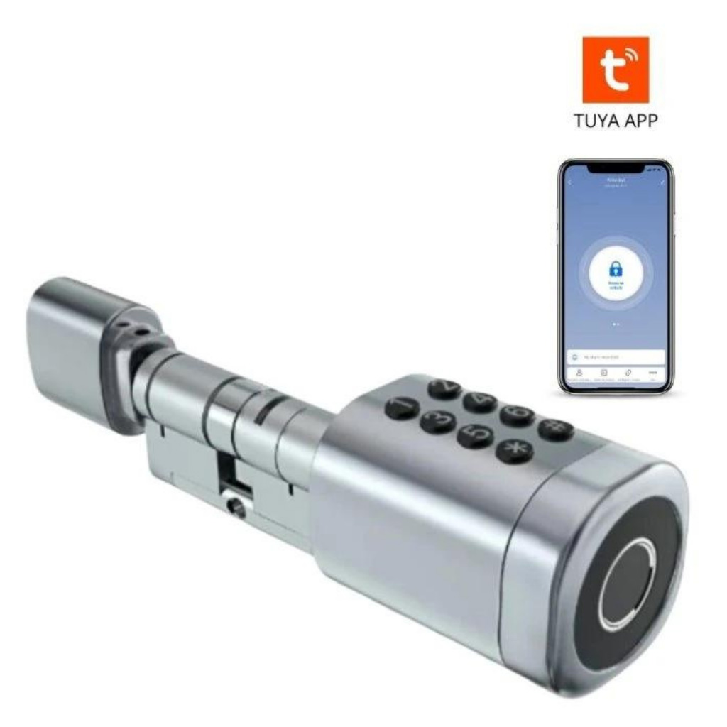 Bluetooth / WiFi elektronická vložka, vhodná pro interiérové i exteriérové použití, ovládání přes aplikaci Tuya, 5 možností odemykání (klíč, otisk prstu, číselný kód, čipová karta, mobilní telefon), doporučená tloušťka dveří (včetně kování) 60mm-120mm, baterie 2 x CR123A, stříbrná
