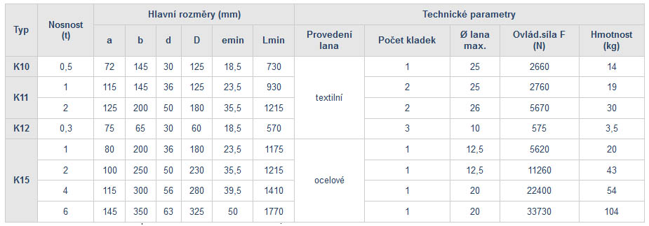 Kladkostroje typ K10–K12 jsou určena pro textilní lana (lana nejsou součástí výrobku).