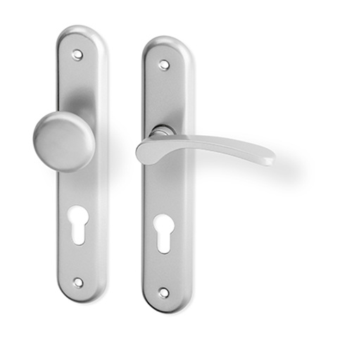 Klika je spojená se štítem a s vratnou pružinou. Bez trnů proti pootočení. Štíty jsou prošroubované skrz dveře.