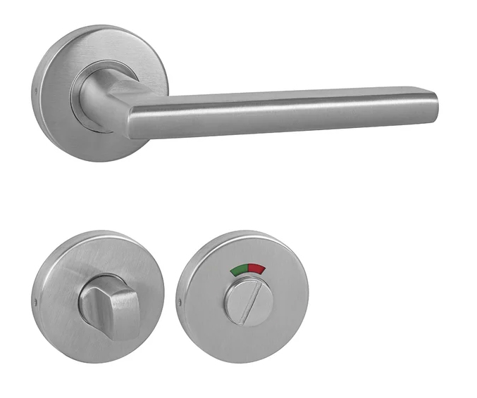 Rozetová klika na interiérové dveře s kulatou rozetou z kvalitní nerezavějící oceli, známé jako nerez a je povrchově upravena. Rozeta má průměr 54 mm a tloušťku 9 mm. Je barevně stabilní a odolná vůči opotřebení. Kování je testováno dle normy ČSN EN 1906: 2012 na 200 000 cyklů.