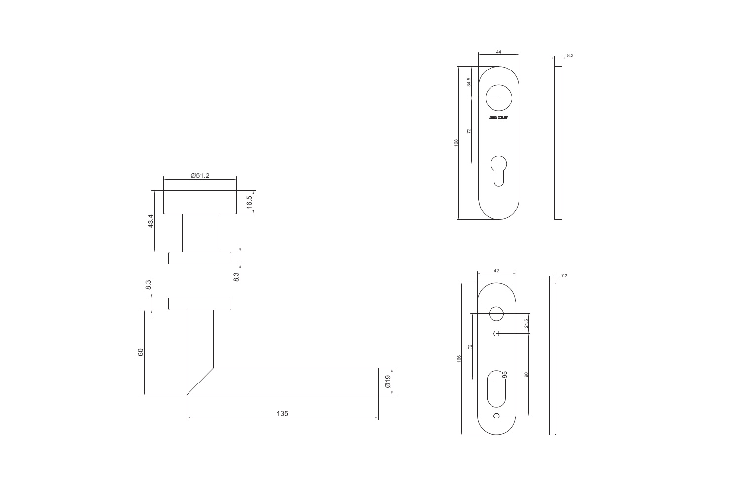 • Krátké oválné štítové kování z nerezového materiálu s pevnou vyosenou koulí a klikou do L s vratnou pružinou.