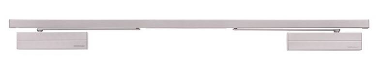 Požární konzole pro dvoukřídlé dveře do 120 kg s integrovaným mechanickým koordinátorem a dvěma elektromagnety pro zajištění dveří v otevřené poloze pro dvoukřídlé dveře.
