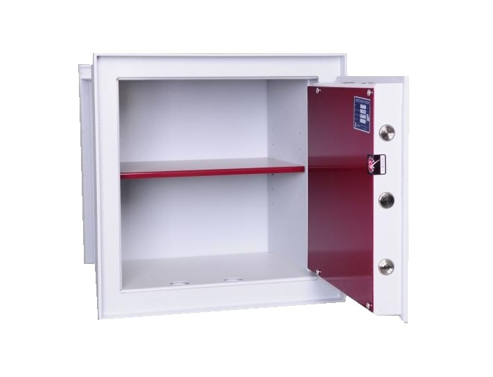 • Dvouplášťový stěnový trezor certifikovaný v I. bezpečnostní třídě s tloušťkou přední části dveří 8 mm (ocel).