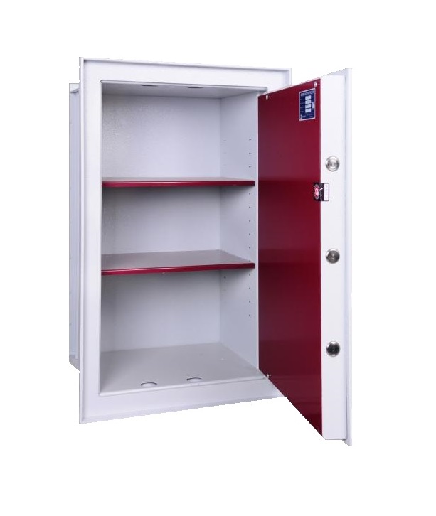 • Dvouplášťový stěnový trezor certifikovaný v I. bezpečnostní třídě s tloušťkou přední části dveří 8 mm (ocel).